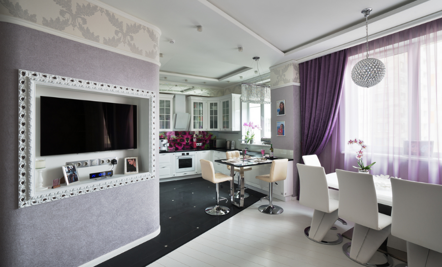 В современных студиях кухня объединена с гостиной, поэтому общее помещение получается довольно большим по габаритам. Здесь обязательно проводится зонирование с выделением участков с разными функциями, и сделать это можно с помощью обоев.