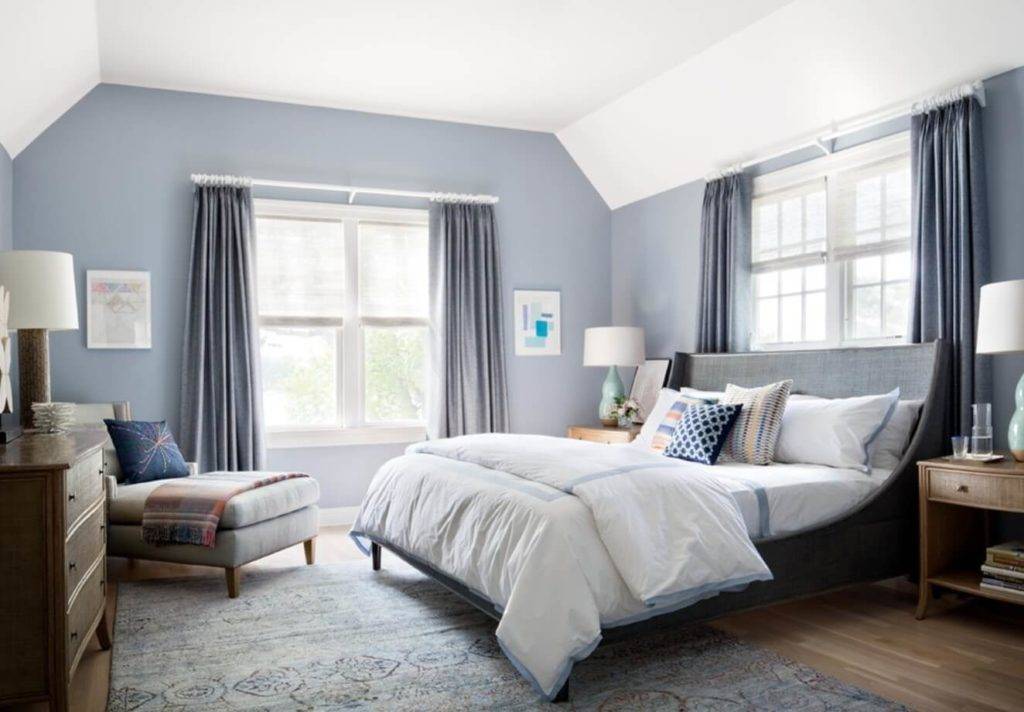 Синий цвет – это уже классика для спальни, поскольку он проверено умиротворенно действует на человека и позволяет быстро расслабиться. Особенно он актуален в просторных спальнях, которую сделает затемненной, а это способствует быстрому и качественному засыпанию. Если же цель стоит сделать более легкое пробуждение, тогда стоит использовать постельные оттенки.