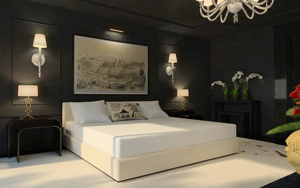 Контраст – инструмент, который реально работает, особенно при использовании классического сочетания черного с белым. Это добавит комнате оригинальности и при этом понадобится всего лишь два цвета, чтобы добиться гармонии и уюта. Идеальный вариант – черные обои и белая/светлая мебель. Однако тут стоит учесть способность черного цвета визуально сжимать пространство, поэтому с ним нужно быть осторожным в небольших помещениях. Если спальня маленькая, тогда лучше поступить наоборот – отделку стен сделать светлой, а мебель приобрести темных оттенков.