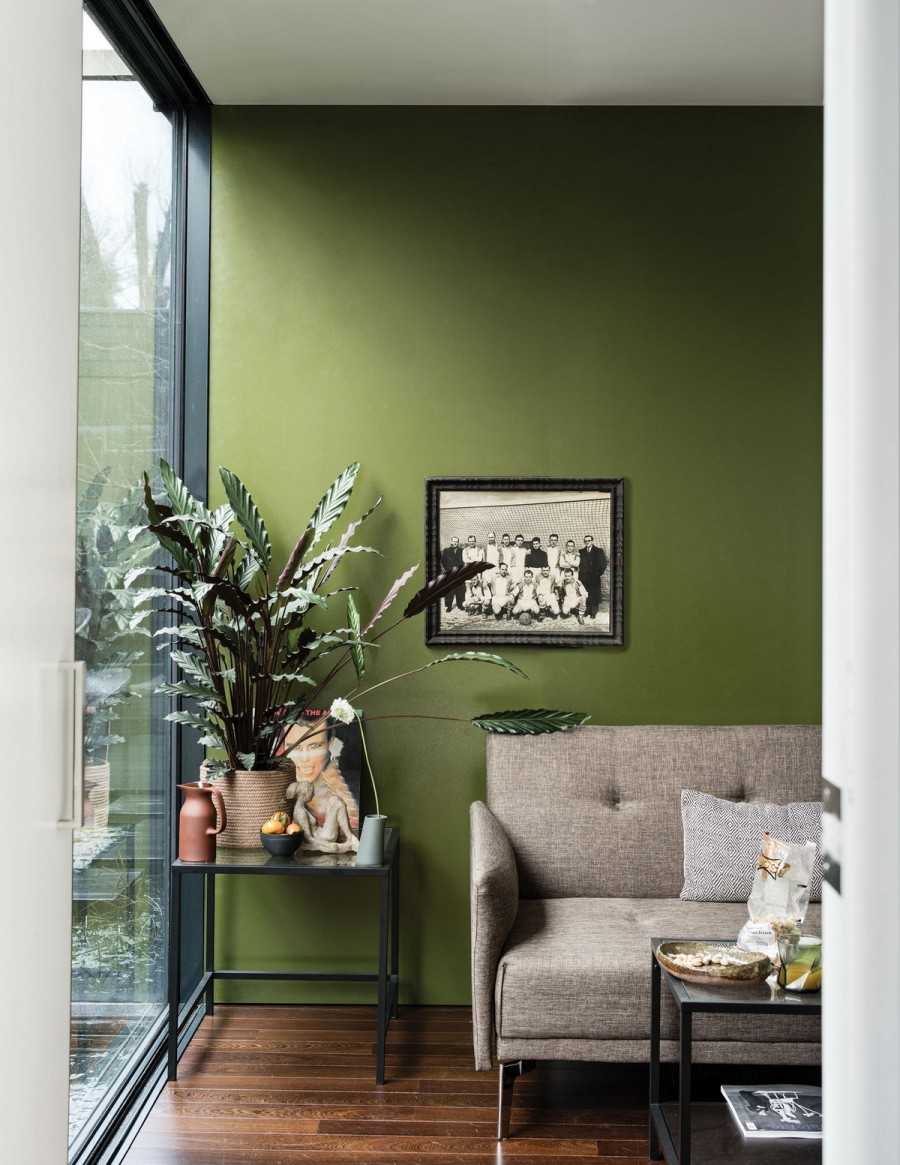 Насыщенные оливковые стены в интерьере навевают раздумья и воспоминания об ушедшей юности, но располагают к самоанализу, поэтому его считают «цветом мудрости». Такие интерьеры принято разбавлять более жизнерадостными оттенками молодости – канареечно-желтым и морковным.
