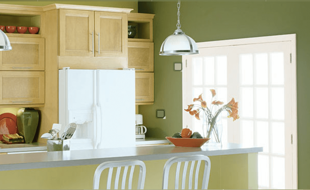 Если стены кухни имеют оливковый оттенок, то цвет мебели лучше выбирать светлых оттенков: белый, бежевый, цвет слоновой кости. Также хорошо подойдут неокрашенные фасады из дерева.
