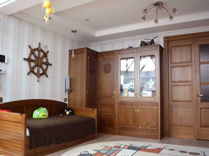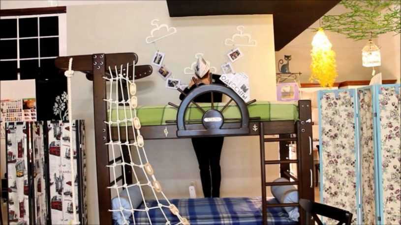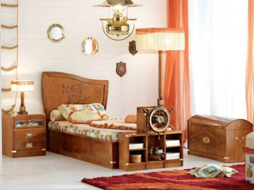 - Установить кровать-корабль. Необязательно покупать дорогую модель, стилизованную под корабль. Можно поставить стандартную двухъярусную кровать и самостоятельно оформить её при помощи верёвочной лестницы, цепей и крутящегося штурвала.