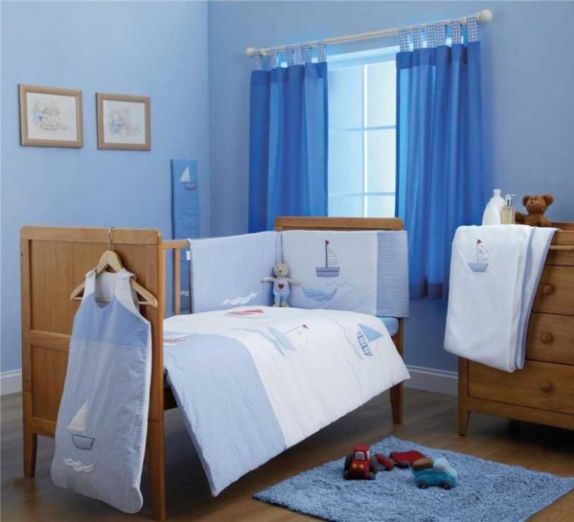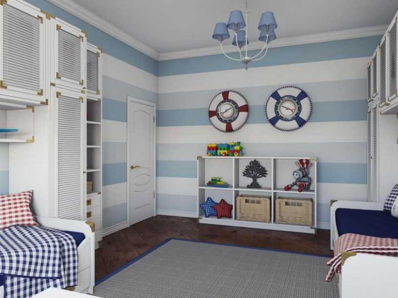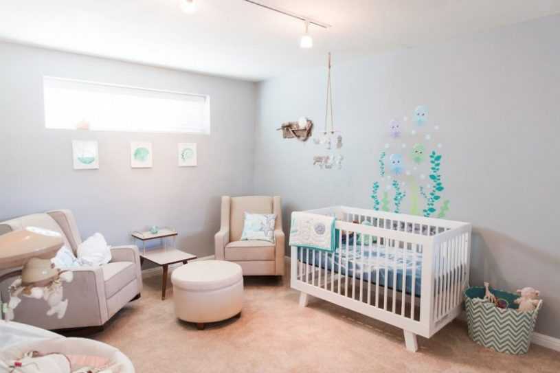 В детской для новорожденного уместно сделать синее, бирюзовое или серое оформление стен с добавлением полосатого принта или нескольких красивых панно. Разнообразные тематические аксессуары в виде штурвалов, якорей или корабликов будут увлекать малыша и дарить ему положительные эмоции. Стены в комнате можно украсить наклейками, трафаретами или даже объемными фигурами.