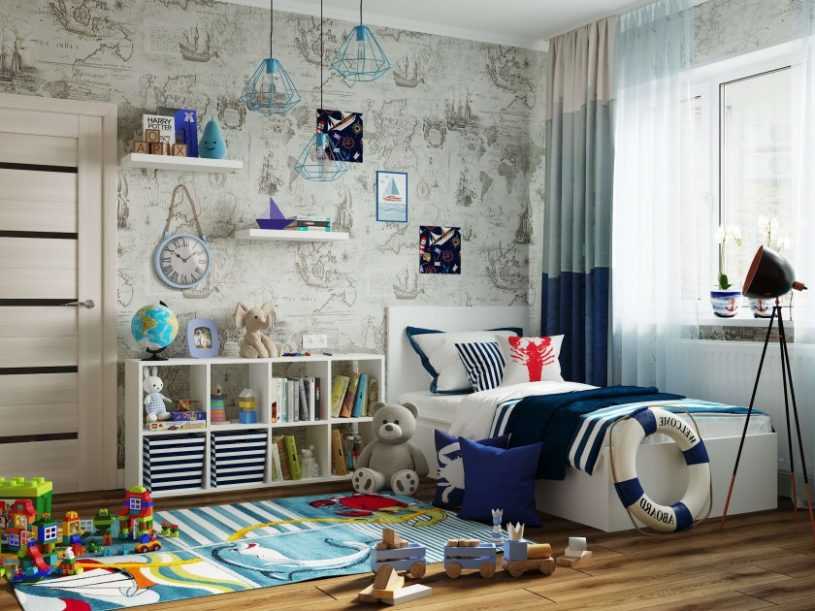 Отдавая предпочтение обоям, тематика которых – море и все, что с ним связано, следует учитывать функциональное назначение. К примеру, если ребенок будет в ней только спать или учиться, следует выбирать более спокойные оттенки, не влияющие на его эмоциональный фон. Если же малыш еще не ходит в школу, а только играет, то можно выбрать для обоев цвета по ярче.