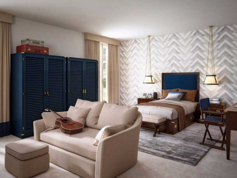 Стены в комнате украшают рисунками с географическими картами, старыми свитками или пиратскими кораблями. Наделить атмосферу нужным настроением помогут разные аксессуары, например игрушечная пальма, бунгало, доски для серфинга или гамак.