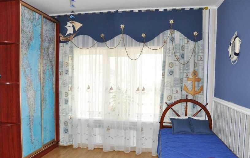 - Не стоит использовать на окнах жалюзи и тяжелые занавески. В комнате с дизайном морской тематики должны быть либо римские светлые шторы, либо воздушный тюль, напоминающий парус.