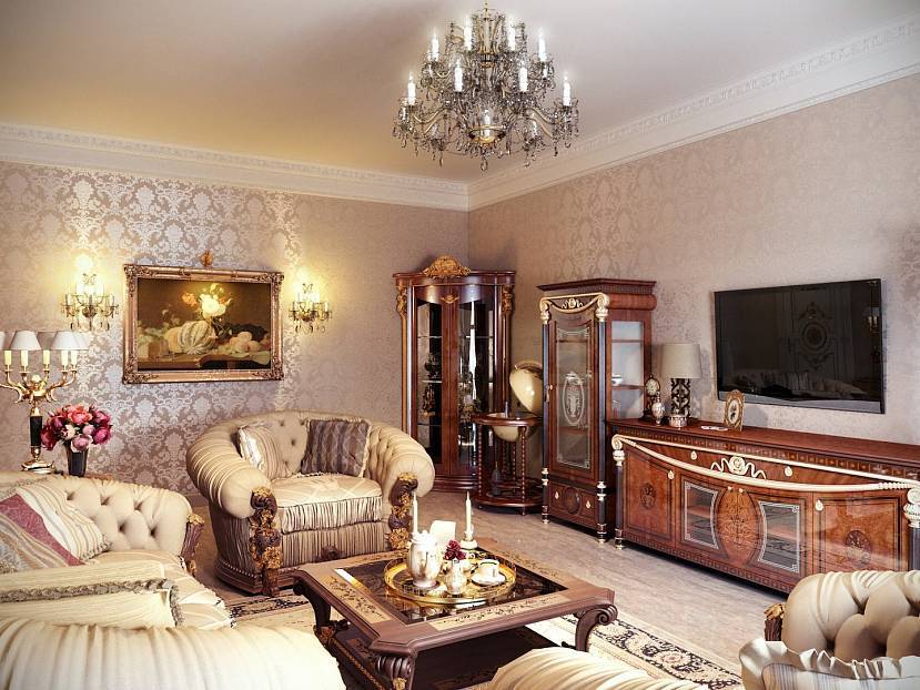 Шикарная гостиная комната в классическом стилеИсточник katchoi.wixsite.com/