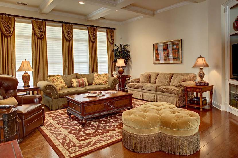 Помимо обивки мягкой мебели удели внимание декоративным подушкам. На пол у дивана можешь простелить ковер, а его узоры повторить в гобеленах на стене. Если в гостиной есть стол – уместна будет декоративная скатерть или салфетки с вышитыми вензелями
