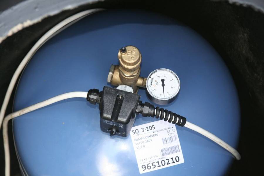 Здесь же важно установить манометр с реле давления. Далее гидробак через техническое отверстие заполняют водой (его подключение насухую запрещено)