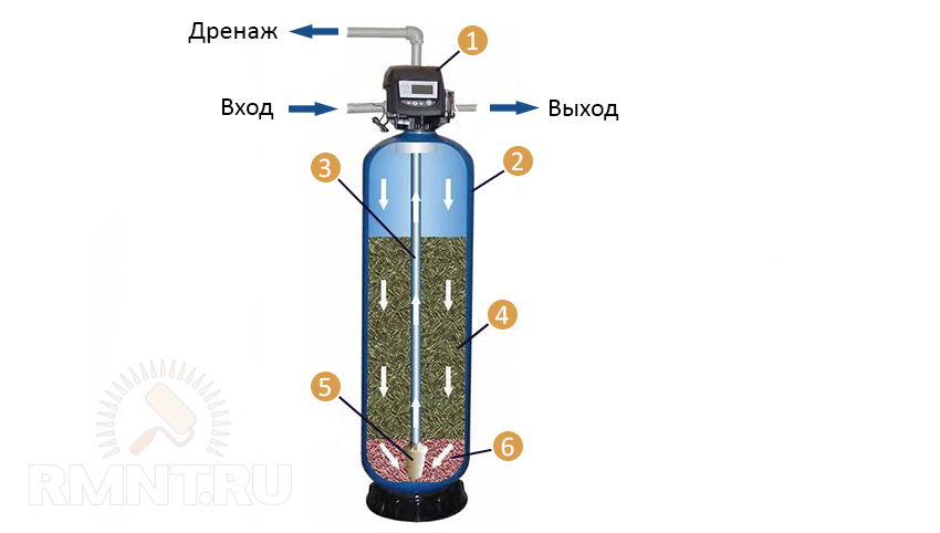 Сорбционный угольный фильтр: 1 — блок управления; 2 — корпус фильтра; 3 — водоподъемная трубка; 4 — активированный уголь; 5 — нижняя распределительная система; 6 — гравийная подложка