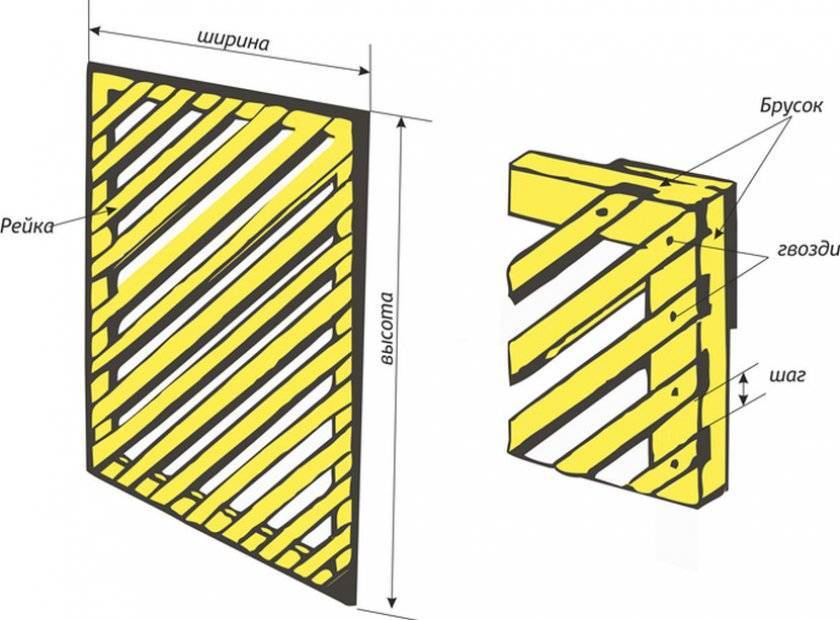 Теперь приступите к монтажу решеток из небольших реек. Закрепите их к рамам диагонально, под углом наклона 45 градусов. Шаг между элементами – порядка 5 сантиметров. В случае когда обрешетка предназначена для закрытия большого проема, расстояние можно увеличить.