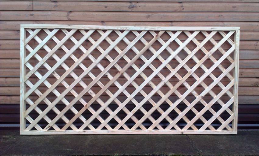 - прямой набор — ячейки получаются прямоугольные, их размер зависит от количества планок в соединении, такой вариант более прост в изготовлении и подходит в качестве шпалеры для вьющихся растений;