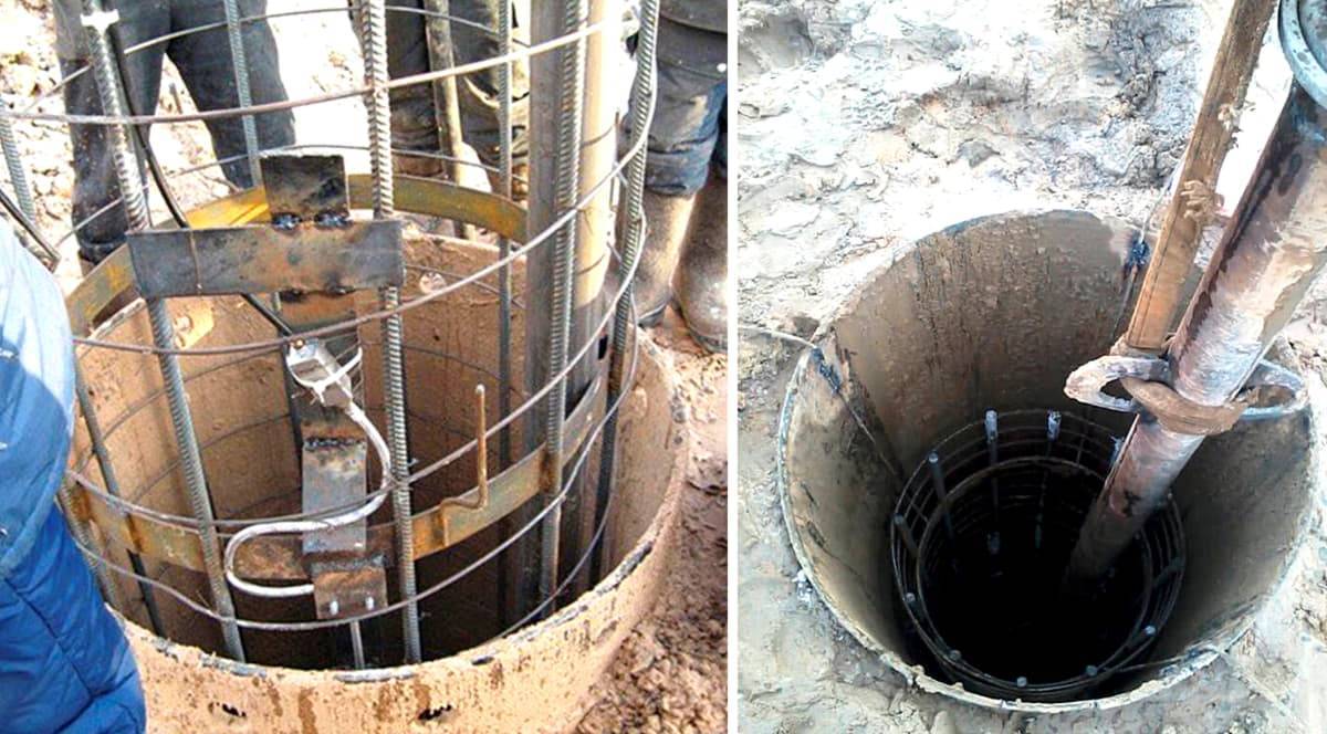 По окончанию бурения до нужной по проекту отметки, снизу сваи разбуривается конус устройством, которое пристраивается на бур (уширитель). Завершив бурение, отверстия нужно освидетельствовать. В отверстие ставится конструкция из арматуры с установленными на ней фиксаторами положения, что нужно для того, чтобы сделать защитную прослойку из бетона, имеющую толщину в 6 см на свайном столбе. После чего спускают в отверстие трубу из бетона с воронкой. В основном бетонолитные трубы состоят из частей или раздвижные.