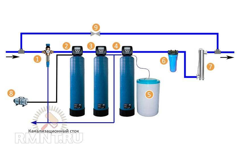 Водоподготовка. 1. Фильтр грубой очистки 100 мкм. 2. Аэратор. 3. Фильтр обезжелезивания. 4. Фильтр умягчения. 5. Бак регенерации с солевым концентратом. 6. Фильтр тонкой очистки. 7. УФ-стерилизатор. 8. Компрессор аэратора. 9. Байпас