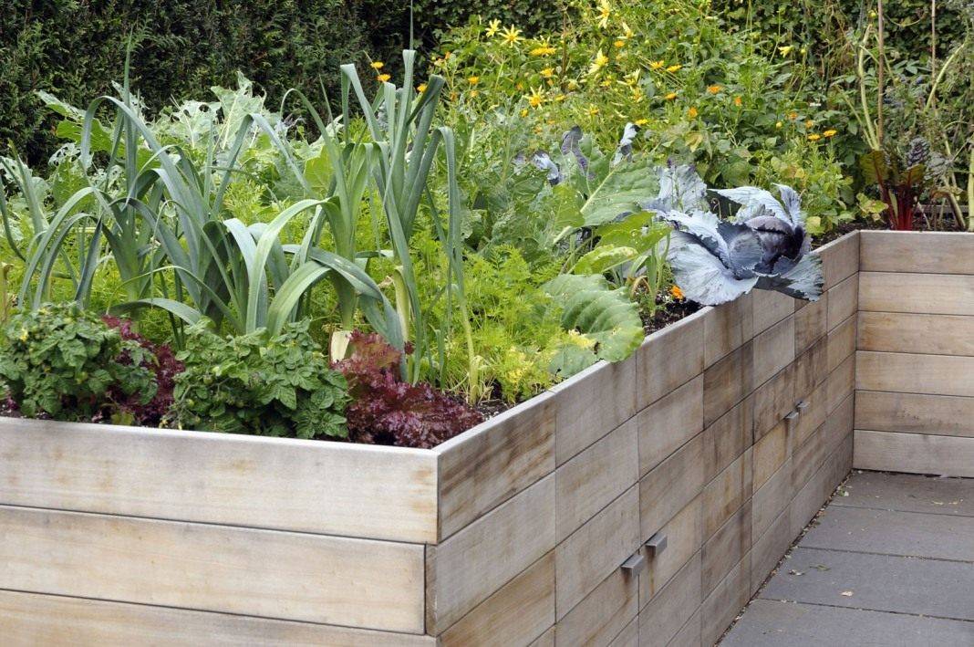Даже обычные прямоугольные конструкции выглядят очень декоративно, если высадить в них сразу несколько культур. Использовать в качестве декора можно и грядки необычной формы. Единственное – не стоит делать насыпи слишком широкими, чтобы к ним была возможность легко подойти с любой из сторон.