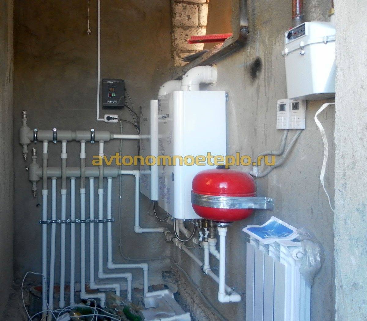 Котел устанавливается в нижней точке системы, от него поднимается вертикальный стояк высотой не менее 2,5 метров. На верхней точке устанавливается расширительный бак, труба переходит в горизонтальное направление с уклоном не менее 3 – 5 мм на погонный метр, расходится к приборам отопления.