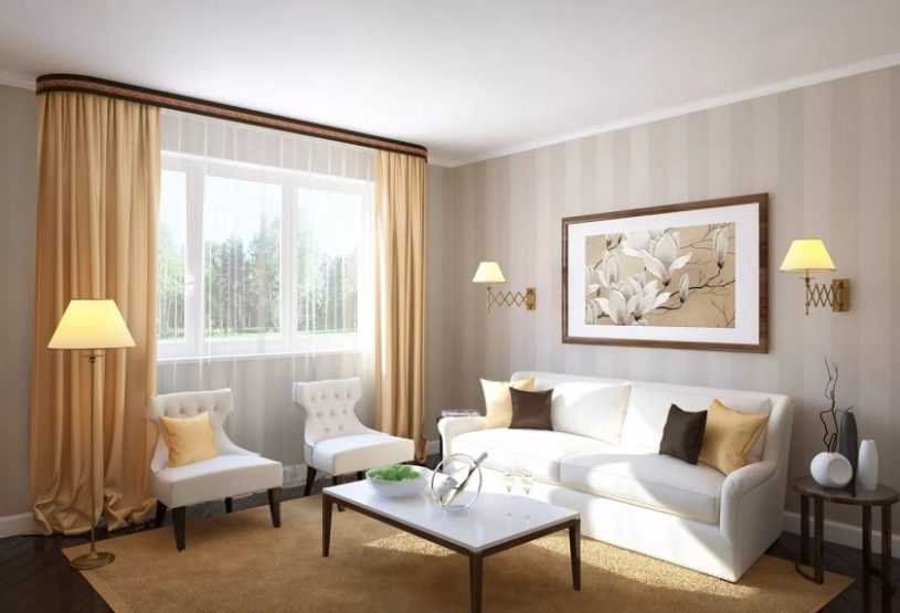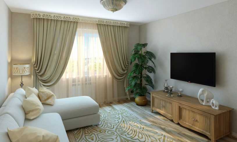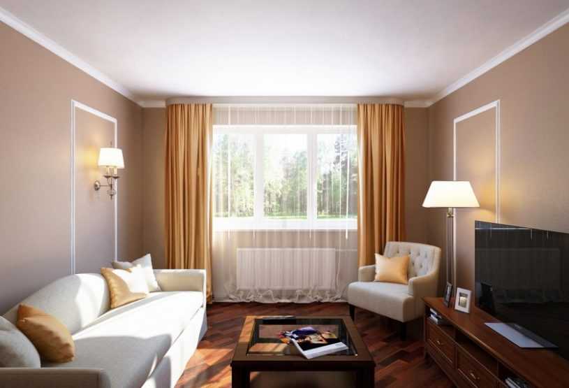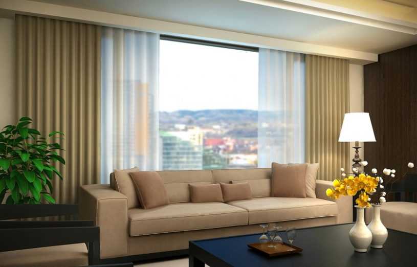Плотные шторы во всю стену сделают узкую комнату визуально шире
