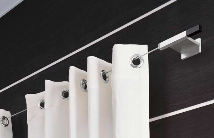 Струнные или тросовые – представляют собой сильно натянутые металлические или нейлоновые струны, натянутые между кронштейнами. Вписываются в интерьер кухни или детской комнаты. Плотные, тяжелые шторы растягивают струну и конструкция провисает, что необходимо помнить при выборе карнизов.