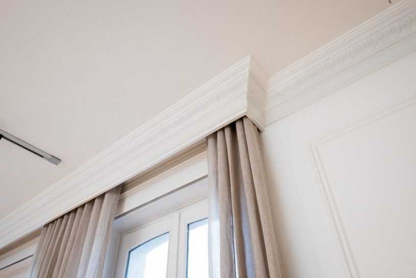 Если шторы подвешены на потолочном карнизе, достаточно легко создать иллюзию скрытого карниза с помощью обыкновенного плинтуса