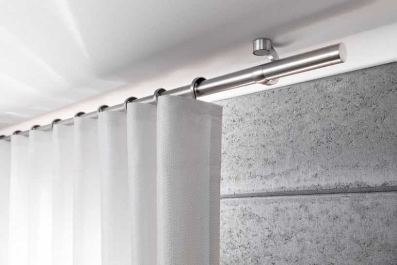 Конфигурация зависит от технических характеристик проема и задач, которые драпировка будет решать. Универсальной считается прямая потолочная конструкция. Штанги делают из стали, дерева или пластика. Профильные варианты выпускают из легких металлических сплавов или ПВХ.