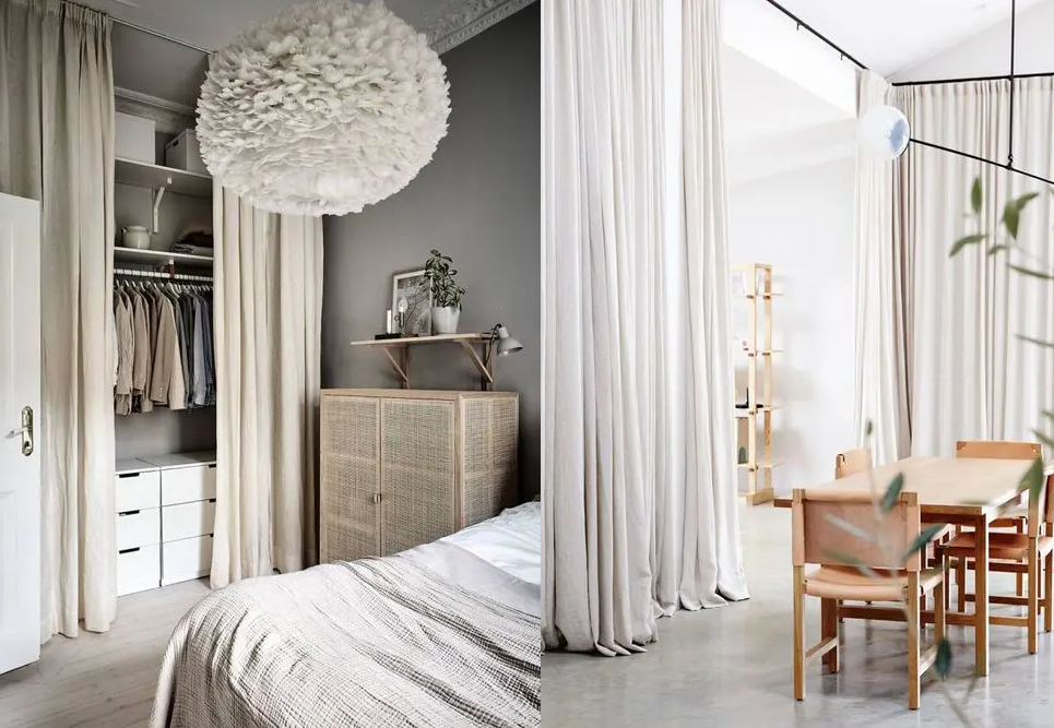Справедливости ради заметим, что штора в дверном проёме — не самый популярный приём. Текстильную перегородку чаще используют в гардеробных комнатах в качестве бюджетного аналога дверей-купе, или между кроватью и рабочим местом в спальне.