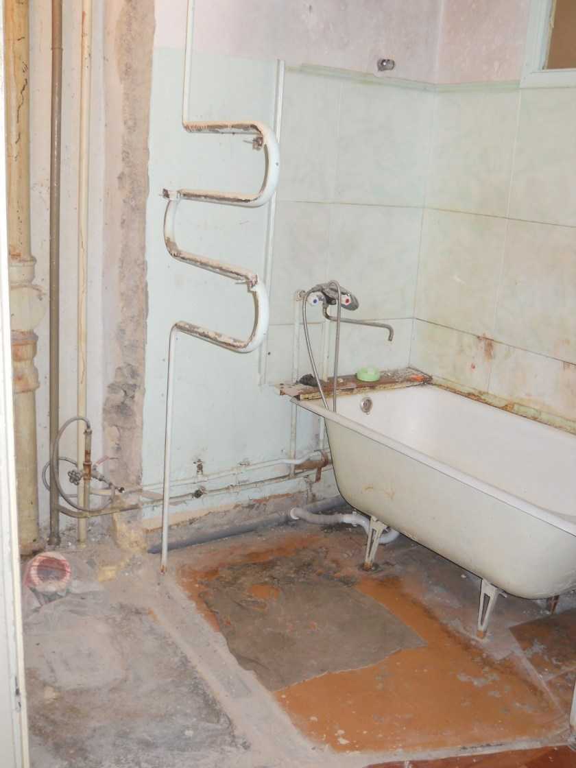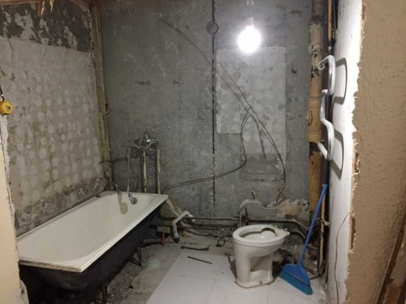 После того как будет вынесена сантехника, зеркала и мебель, нужно будет перекрыть водопровод, канализацию и отсоединить полотенцесушитель. Далее следует демонтаж перегородки, благодаря чему площадь помещения станет ощутимо больше.
