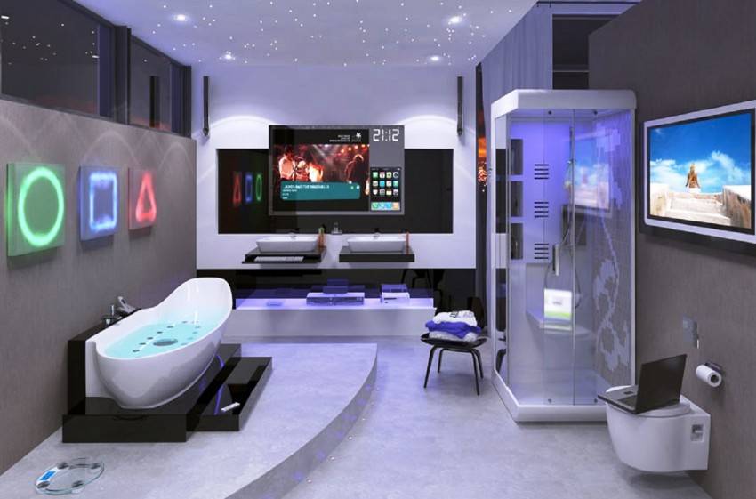 Хайтек отличается минимализмом и функциональностью, ему характерны холодные тона в оформлении и подсветке, отсутствие украшений, большое количество стекла, пластика и хромированных деталей. Сантехника отвечает требованиям высоких технологий, мебель проста и практична.