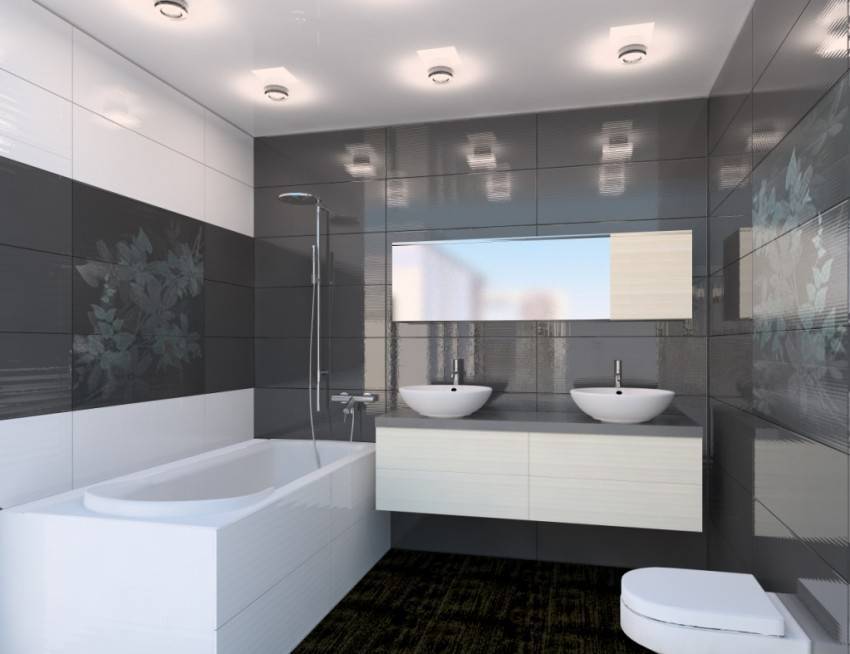 Вариант № 3. Зонирование цветами. Контрасты используются не только в декоративных целях, но и для выделения функциональных зон в помещении. Этот вариант наиболее актуален в разработке дизайна больших совмещенных санузлах.