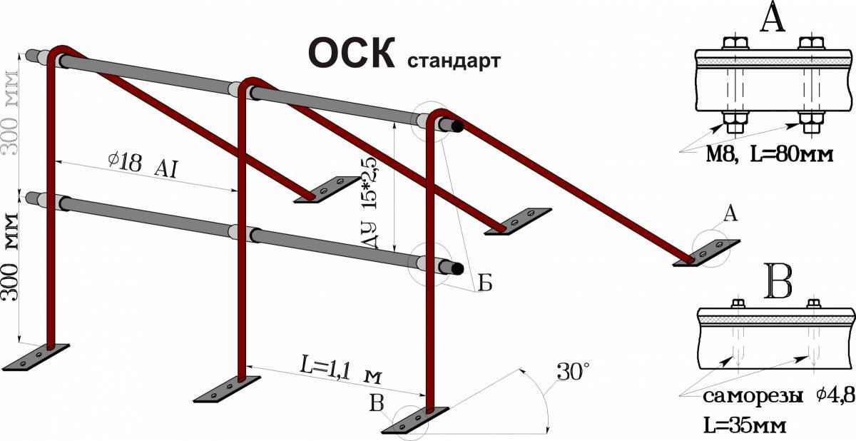 Стандартная конструкция защиты несложная. Обычно она состоит из расположенных вертикально опор и перекладин, которые расположены горизонтально.