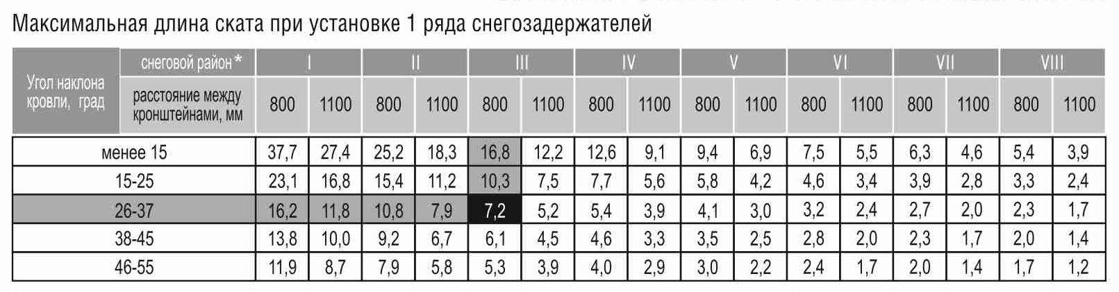 Смотрим значения на пересечении — 7,2 м. В данном случае достаточно 1 ряда снегозадержателей при монтаже кронштейнов через каждые 800 мм. При установке кронштейнов на большем расстоянии, потребуется 2 и более рядов. При этом вид кровельного материала значения не имеет. Так, расчет снегозадержателей для металлочерепицы, гибкой черепицы и профнастила абсолютно одинаков.