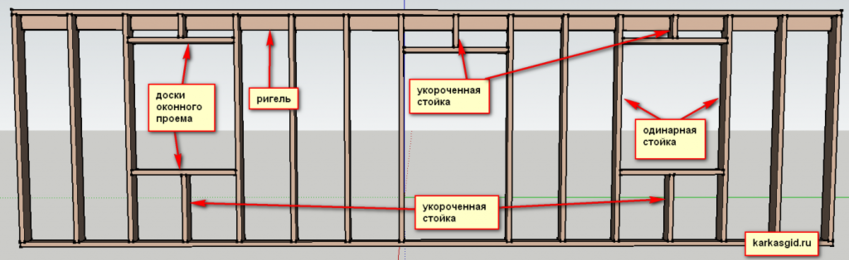 Вместо сдвоенных стоек появляется новый элемент — ригель (на фото выше). Ригель — это доска (стоящая на ребре), врезанная в самой верхней части стоек каркаса (перед нижней обвязкой) снаружи или внутри. Я буду врезать снаружи, ведь это удобнее, но правильнее врезать ригель внутри (но тогда неудобно поднимать стену, хотя это и решается). Ригель распределяет нагрузку от балок перекрытия, а значит, нам не нужен хидер (ригель по сути уже и есть хидер, только во всю длину стены и одиночный).