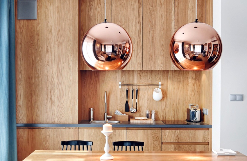 Чтобы в целом установленное оборудование выглядело органично и составляло эффектную единую композицию, стоит комбинировать разные типы техники. Над обеденным столом размещают одну или несколько крупноразмерных люстр, для освещения рабочих поверхностей используют небольшие направленные споты, точечные светильники.