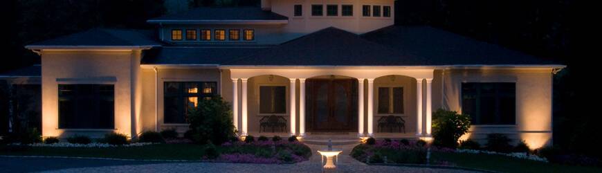 При обустройстве освещения придомового участка лучше всего использовать эффект плавной заливки. При этом по периметру и на воротах с целью ограничения обзора с улицы рекомендуется устанавливать более яркие осветительные приборы.
