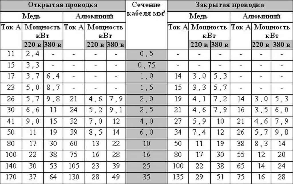 Кроме этого нужно закупить непосредственно светильники, выключатели, розетки, электрический щиток, ВД(УЗО), провода. Причем розетки и провода выбираются с учетом суммарной мощности электрических приборов. Для расчета необходимо сложить мощности ламп и других приборов, которые будут питаться одним проводом, и по таблице выбрать провод.