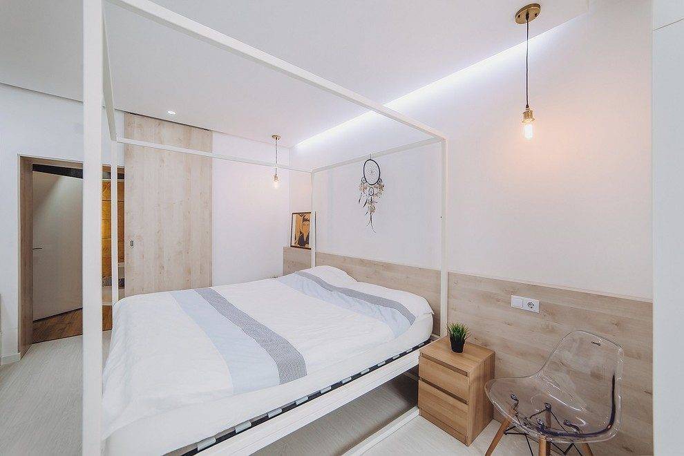 Современный интерьер спальни с прикроватными лампами, закрепленными на потолке