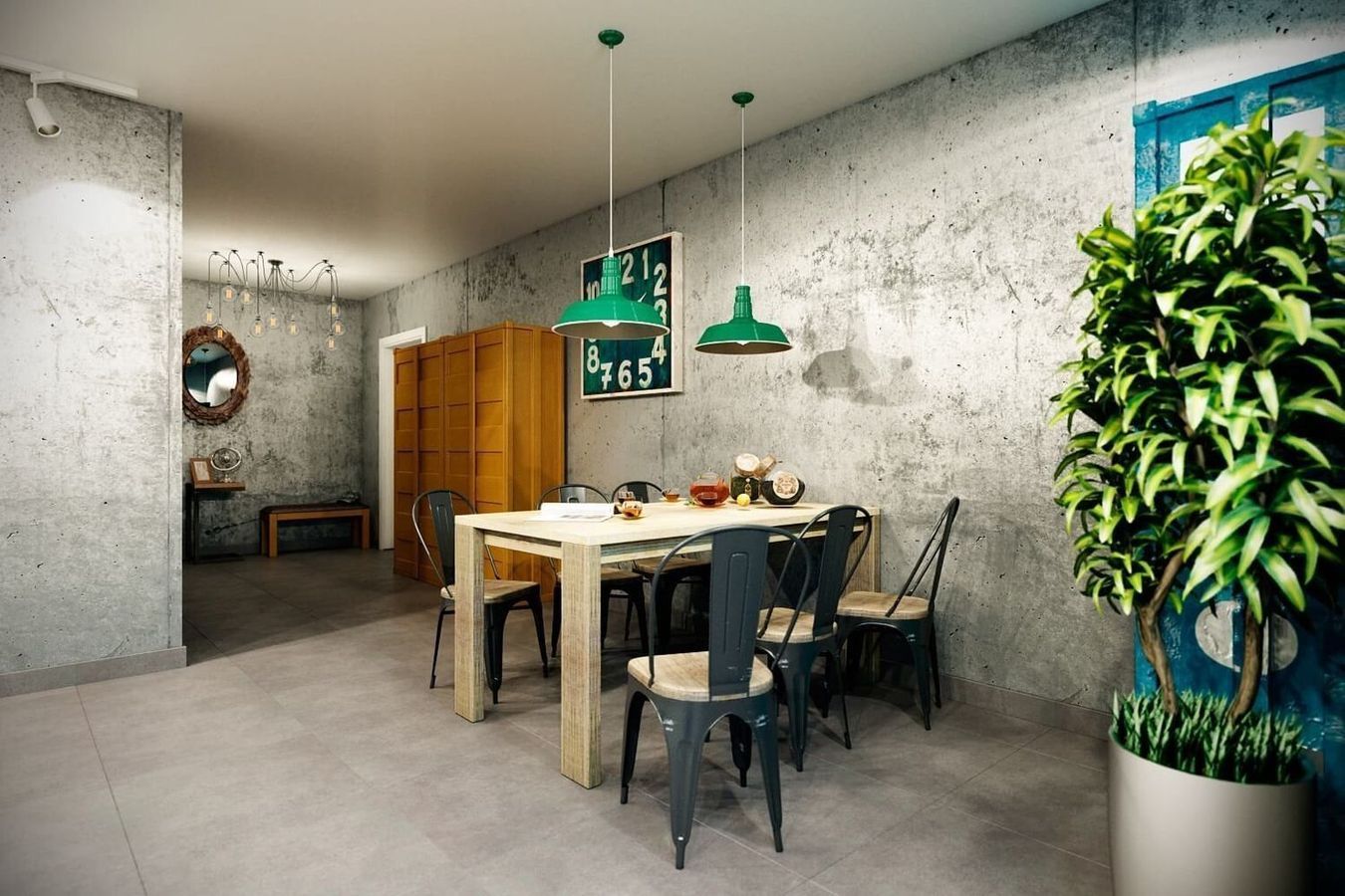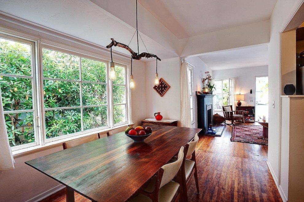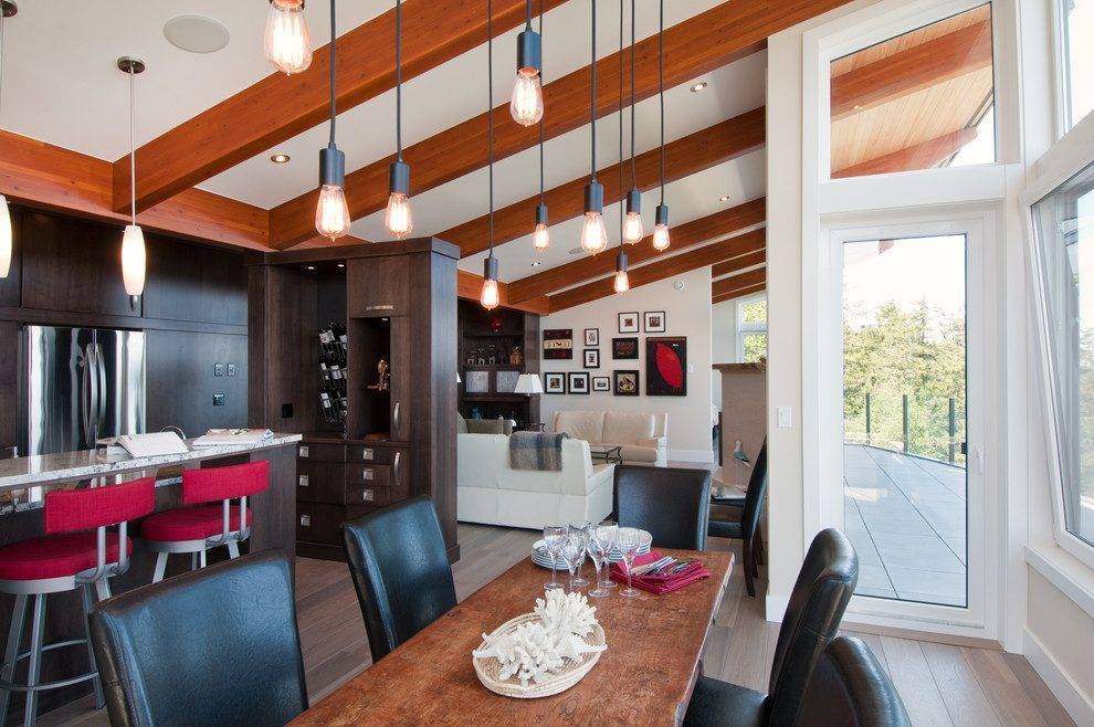 - Именно обеденная зона собирает всех близких, друзей и знакомых – а значит, без нескольких подвесных светильников здесь не обойтись.