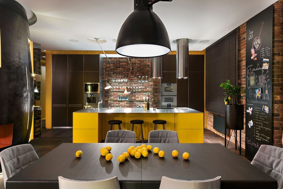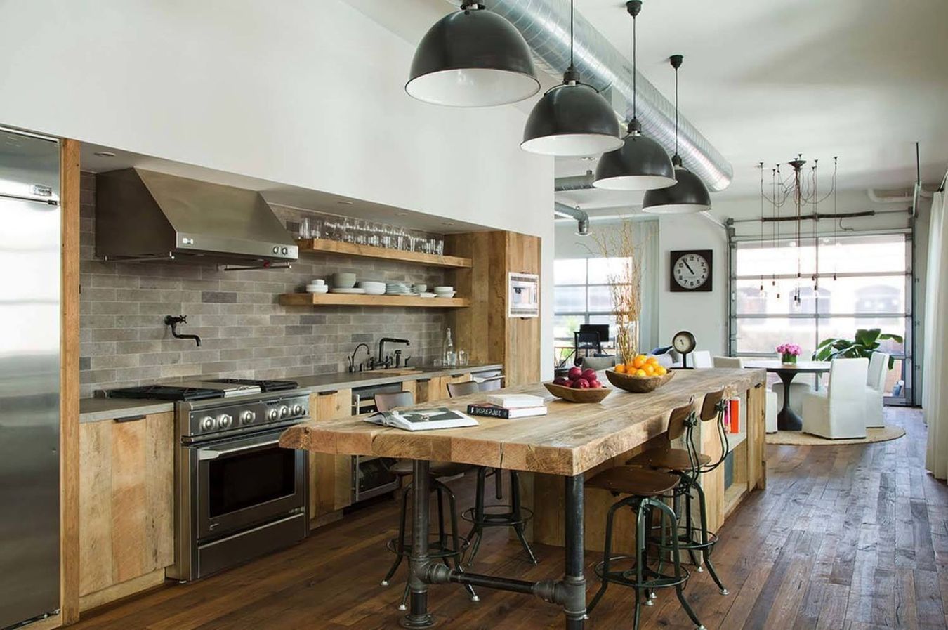 - Освещение для кухни в стиле лофт разнообразное. Кроме потолочных светильников нужны переносные, настенные, настольные или встроенные точечные.
