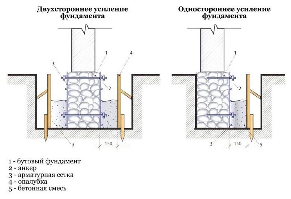 Для расширения фундамента удаляют отмостку, если она есть, расчищают грунт вокруг дома и выкапывают траншею, в которую закладывают арматурный каркас. Чтобы конструкция была прочной, для связки фундаментов применяют арматурные стержни. Их забивают в отверстия, высверленные в существующем фундаменте через каждые 10-15 см. Между старым и новым фундаментами делают компенсационный зазор 20-25 мм.