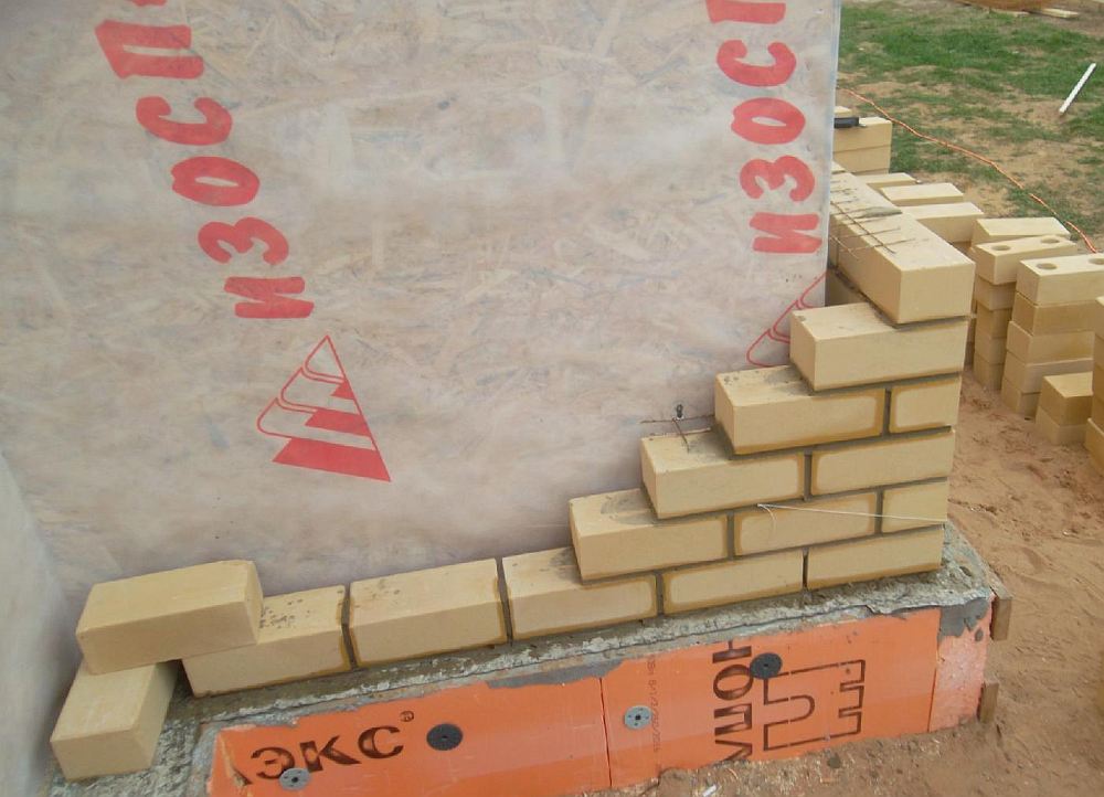 Стена в один кирпич получается достаточно шаткой, поэтому ее крепят к стене дома, используя специальные гибкие анкера. Особенно внимательно и тщательно кладут первый ряд, это определяет последующую ровность кладки. Выложив по периметру дома первый ряд, «поднимают» углы до четвертого кирпича. После этого ряд за рядом производят кладку ложком (плашмя) в полкирпича.