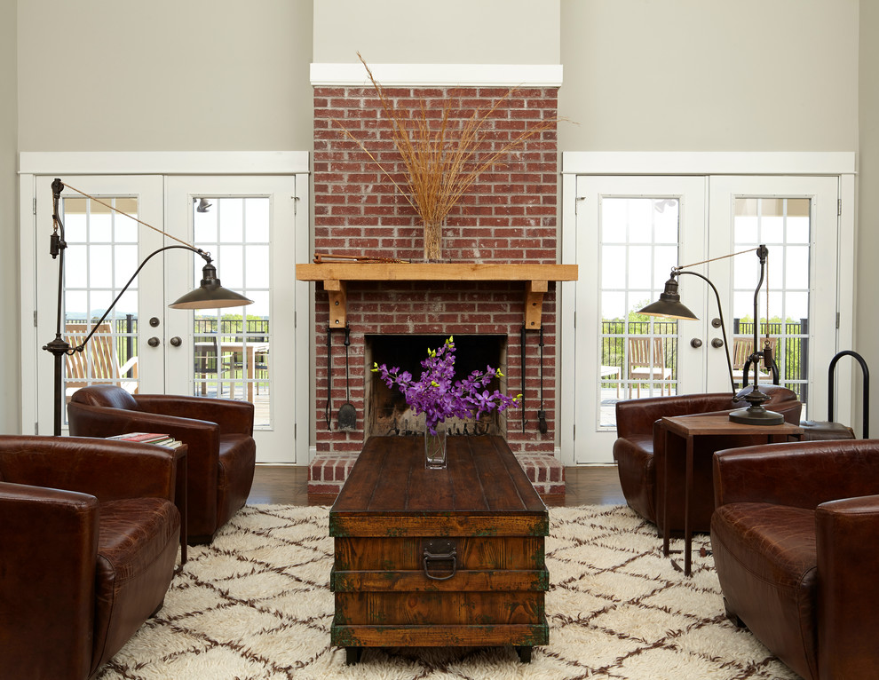 Камин с отделкой из дерева выглядит очень тепло и уютно.