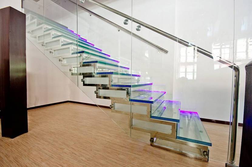 - Стеклянное ограждение с потайным крепежом. Наиболее популярный вариант. Полностью прозрачная конструкция (ступени, ограждение) создаёт впечатление невесомости. Для обеспечения безопасности (увеличения «заметности») добавляется цветовая подсветка или монтируется локальное освещение этой части помещения.