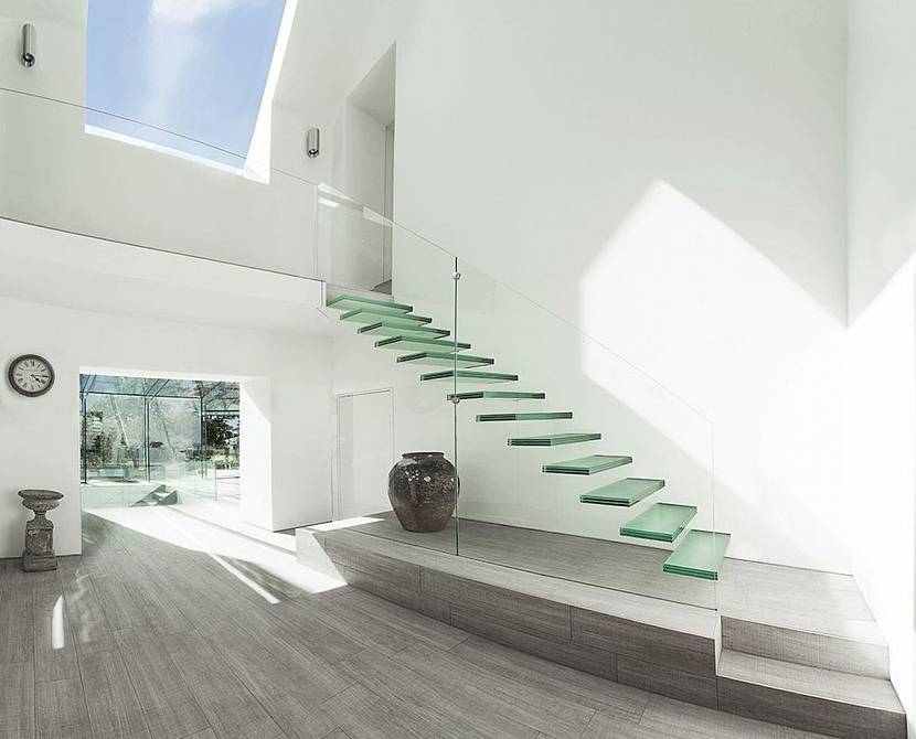 Лестница из калёного стекла в интерьере загородного домаИсточник prosteklo.com