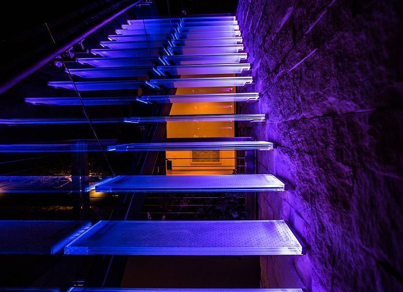 Лестница из стекла со встроенным декоративным освещениемИсточник dekormyhome.ru