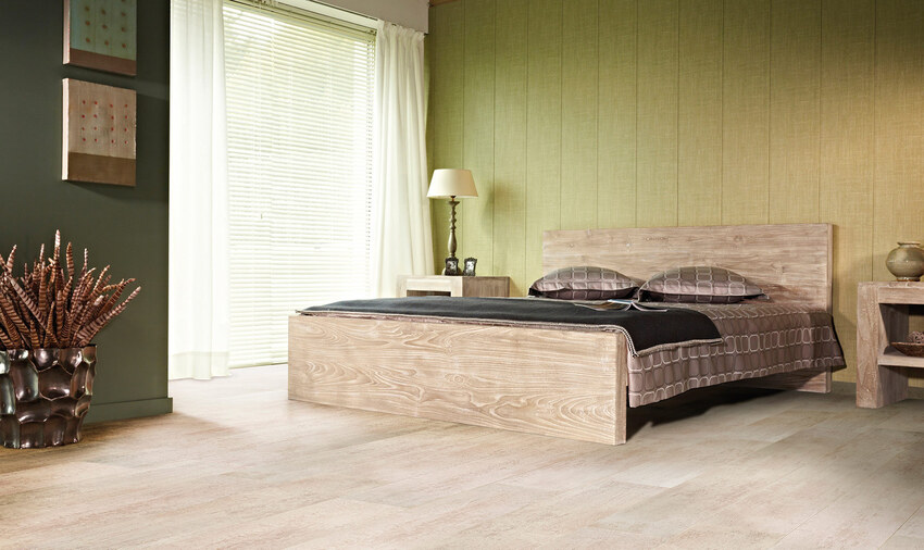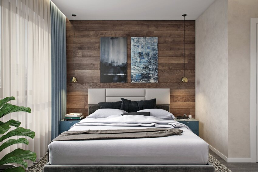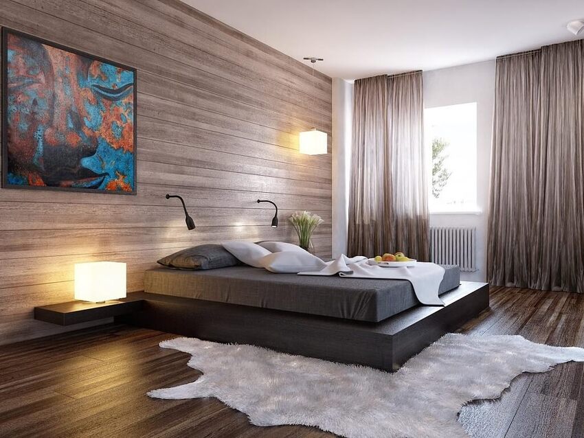 Спальная комната задает настроение на весь день. Ламинатом оформляют стену у изголовья кровати, или отделывают им стену напротив. На них затем вешают картины, фотографии или панно, подходящие по стилю.