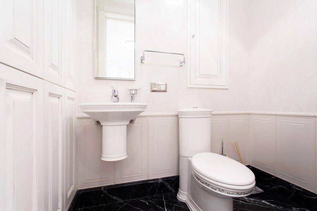 Белый цвет считается универсальным в отделке интерьера небольшого туалета. Он делает комнату шире и светлее. Однако чисто белая отделка придает туалету излишнюю «стерильность», поэтому его комбинируют с другими цветами. Также вместо ярко-белого можно выбрать молочный оттенок, слоновую кость, пастельные цвета.