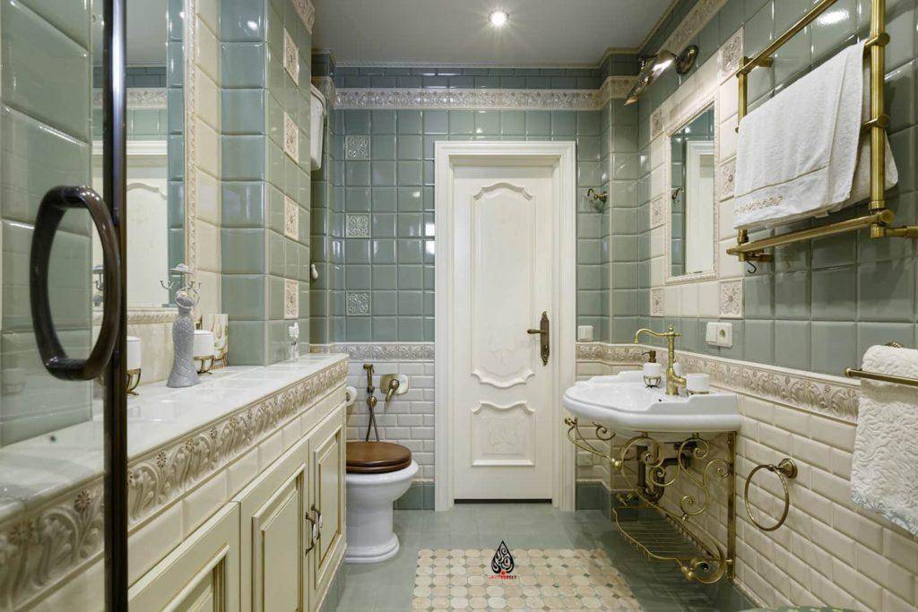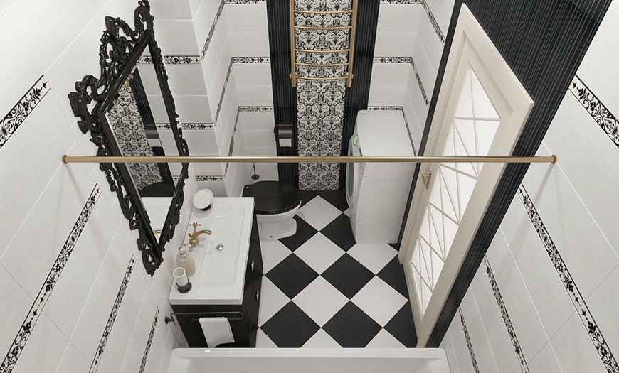 В таком стиле преобладают квадратные формы, угловая сантехника и мебель. Стены и пол украшены геометрическими узорами. Допускается наличие обоев и окрашенных поверхностей.