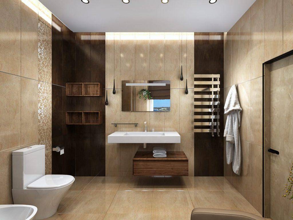 Отлично смотрится теплая бежевая цветовая гамма, представленная песочным, золотистым, светлыми или темными оттенками бежевого. При такой отделке используется дерево. Любителям темных оттенков подойдут сочетания черного с белым или красным. Кофейные оттенки делают интерьер дорогим, стильным. Коричневые оттенки прекрасно гармонируют с металлическими и деревянными аксессуарами, белоснежной сантехникой.