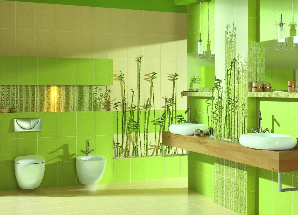 Используются любые варианты зеленого цвета. Красиво и стильно выглядит отделка оливкового цвета, который разбавляют желтым, розовым, персиковым, бежевым, серым. Сочетания с преобладанием зеленого дают возможность создать красоту и уют без применения дополнительных элементов декора.