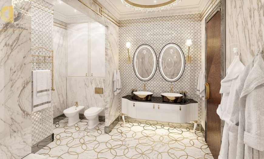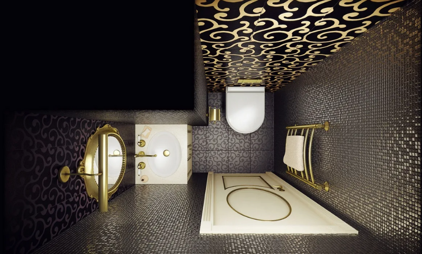 В моде декорированные элементы из позолоченной стали, меди и латуни. Они ассоциируются с роскошью и комфортом. Это могут быт винтовые смесители, бра на стене, мыльница с позолоченным основанием.
