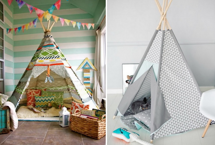 Оригинальный вариант сооружения – индейский вигвам. К нему не останется равнодушным ни один ребенок. Его возведение не займет много сил и времени, а сама конструкция очень компактная. Такой шалаш легкий и мобильный, его можно переставлять в разные комнаты.